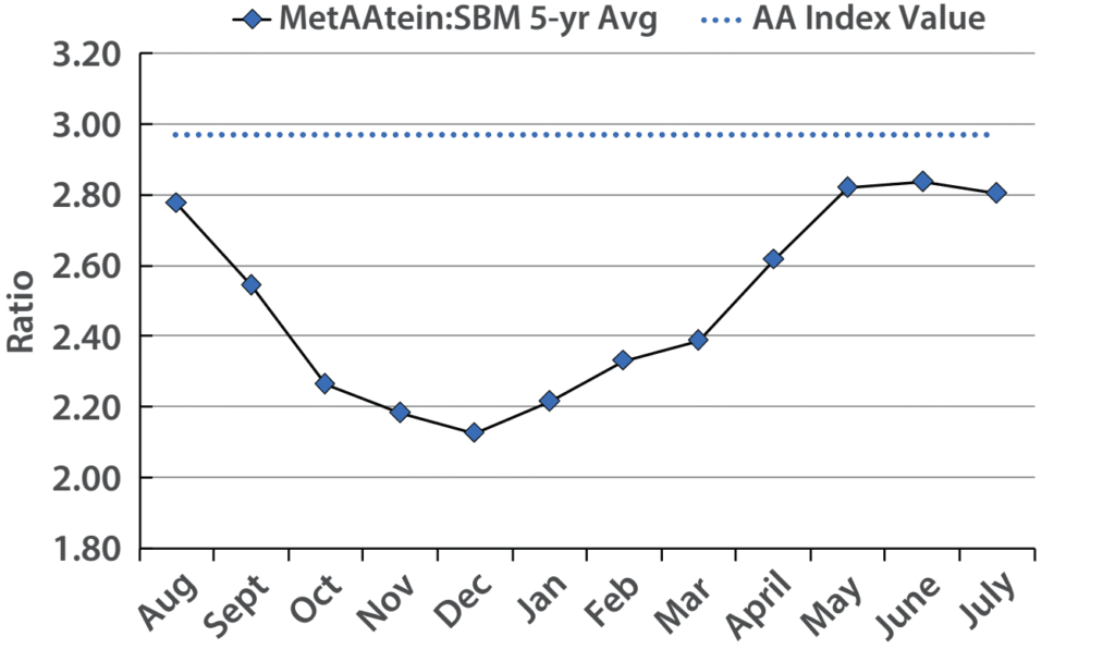 Figure 1. 5-year average price of MetAAtein relative to soybean meal (Chicago Mercantile Exchange nearby futures) and the AA Index value for MetAAtein.