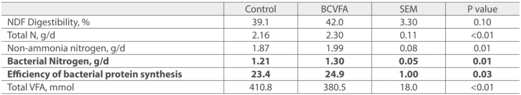• Supplying BCVFA increased fiber degradability and efficiency of bacterial protein synthesis regardless of substrate supply in vitro.