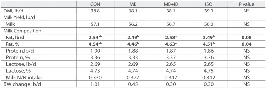 • A numerical difference of 0.04 lb/d in fat yield was observed between control and MB+IB supplementation (not different statistically). This would yield an increase of US$ 0.12/cow assuming July 2023 component prices by the USDA. The cost of these supplements needs to be considered to evaluate ROI.